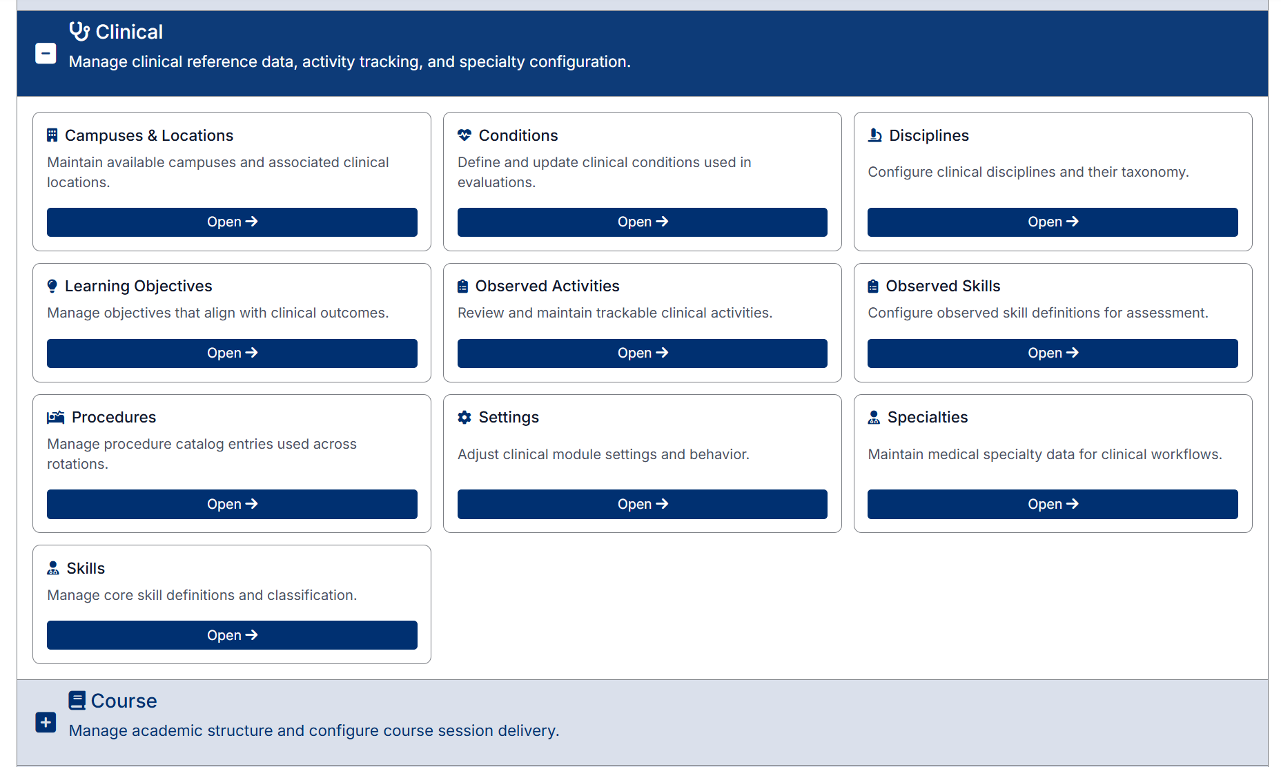 This section plays a critical role in ensuring consistency across the Student, Preceptor, and Clerkship Director portals by defining the clinical framework used in evaluations and activities.