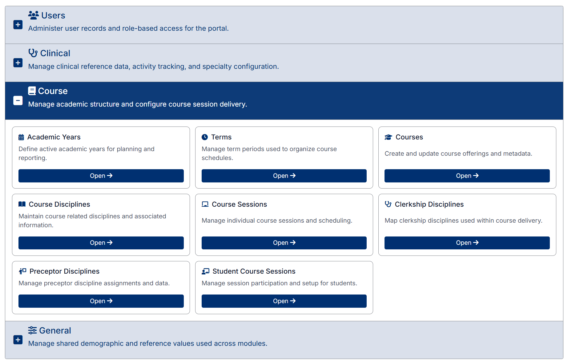 The Course section allows you to manage academic structure and course delivery.