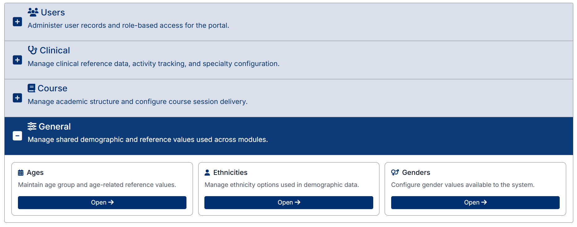 Each section can be expanded to reveal tiles that link directly to specific management screens.