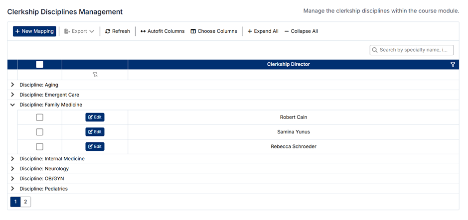 - Expanding a discipline displays the Clerkship Directors assigned to it