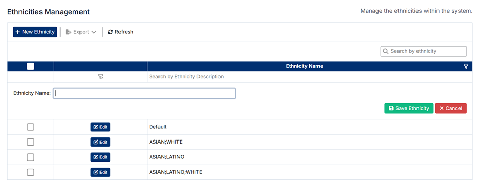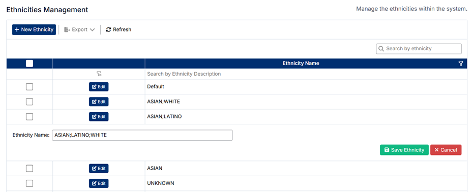 The Ethnicities Management screen displays a list of configured ethnicity values.