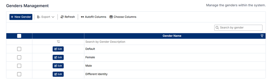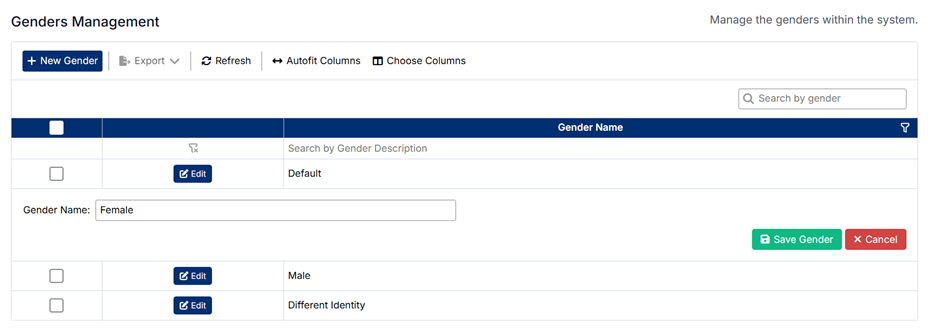 - Edit – Allows you to modify an existing gender