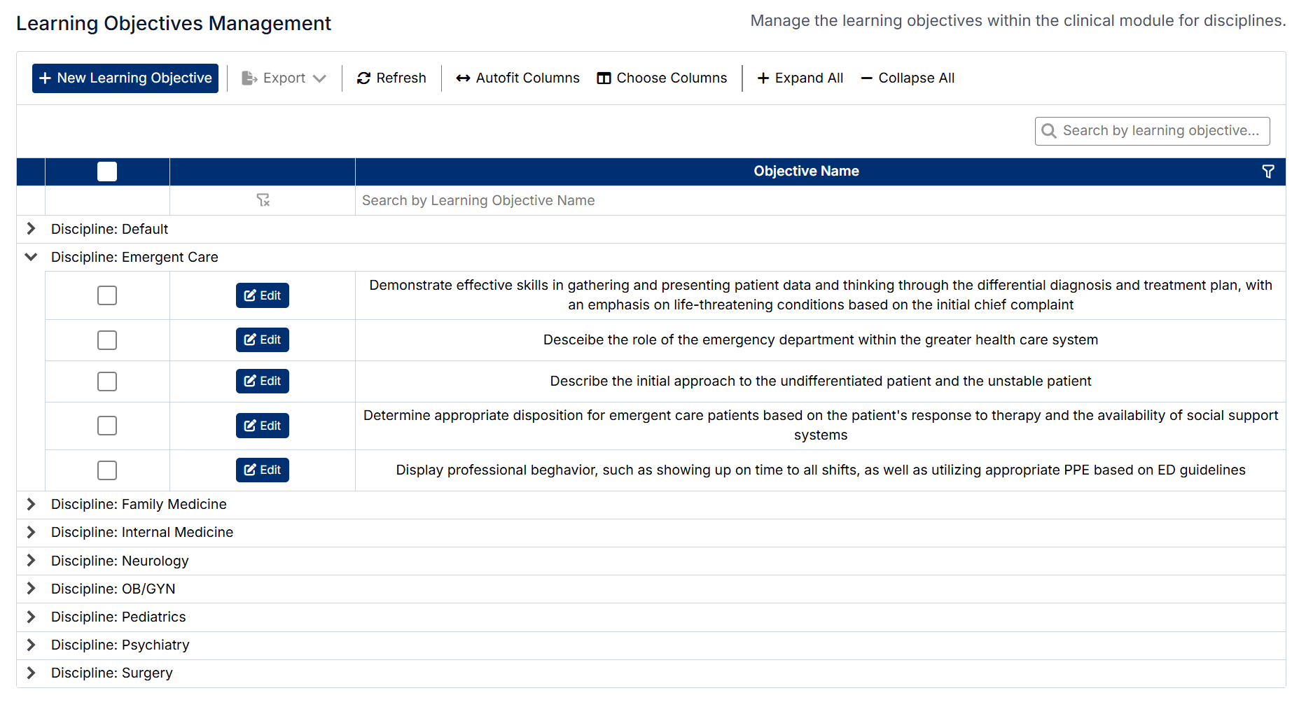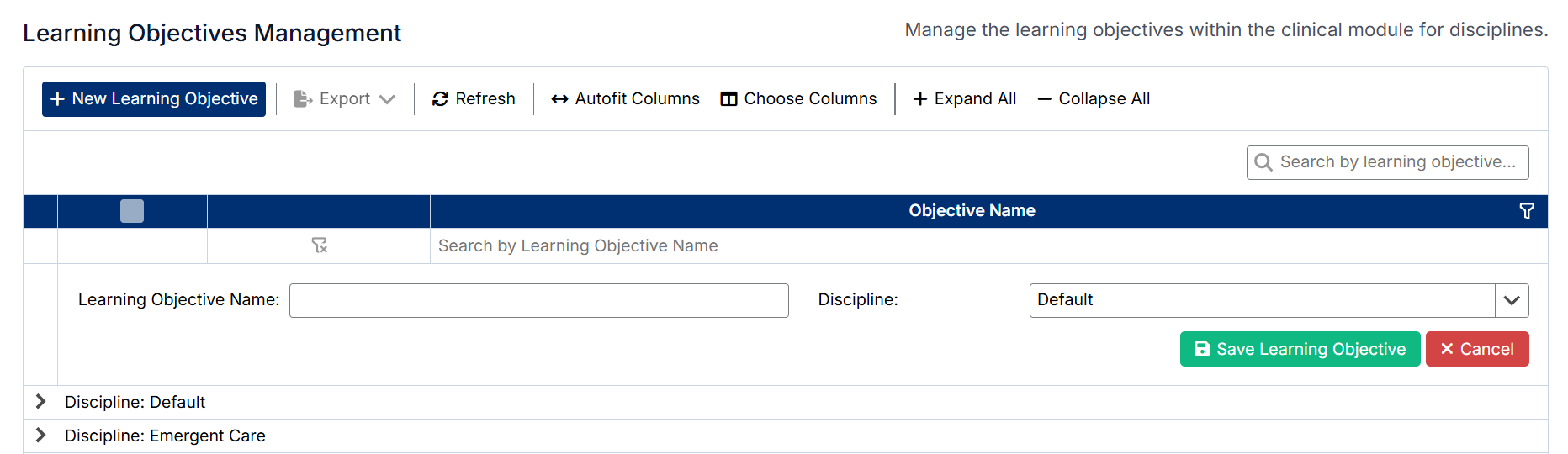 Learning objectives are organized by Discipline and are used in assessments, evaluations, and reporting to measure student performance.