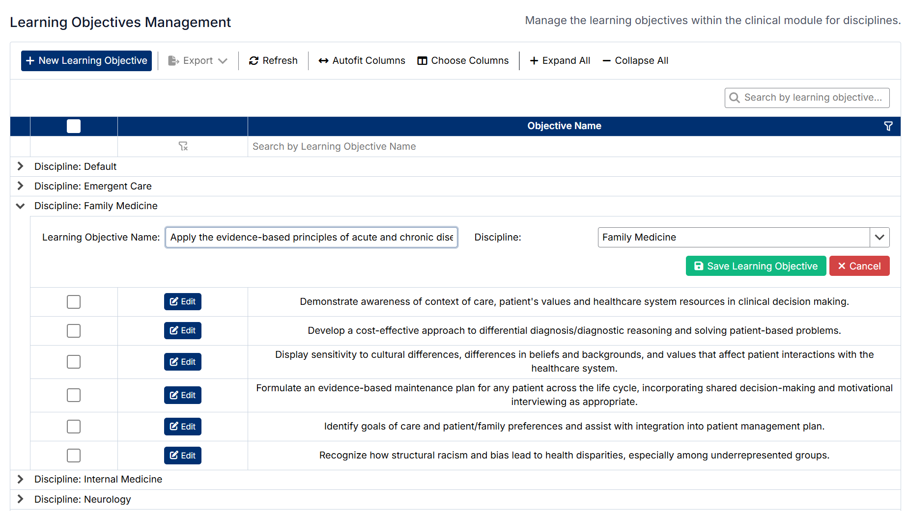 The Learning Objectives Management screen allows administrators to define and maintain learning objectives used within the clinical module. These objectives represent the expected knowledge, skills, and competencies that students should demonstrate during their clinical training.