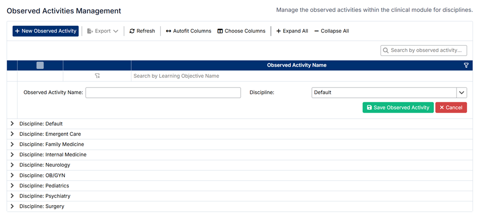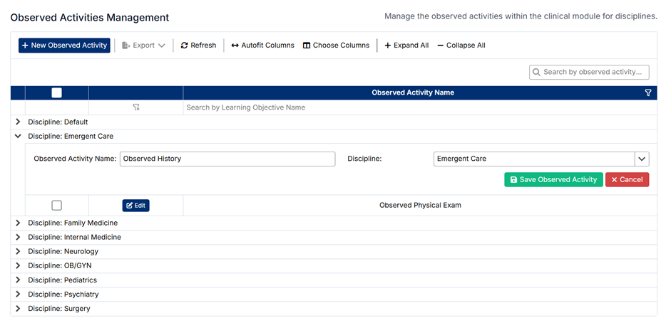 The Observed Activities Management screen allows administrators to define and maintain the clinical activities that can be observed and tracked within the system. These activities represent the tasks or interactions that students perform and are evaluated on during their clinical training.