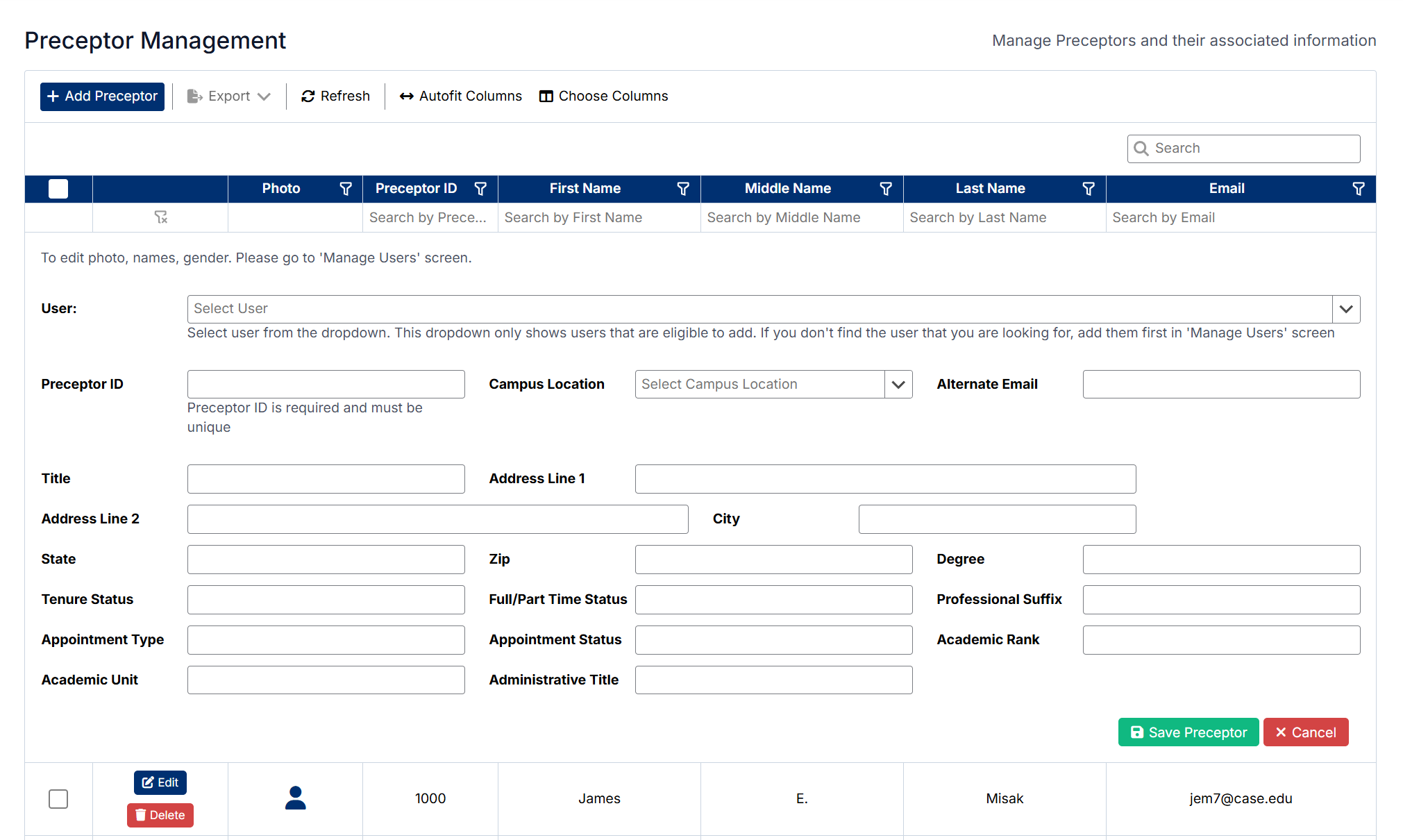 The Preceptor Management screen will display a list of all preceptors in the system.