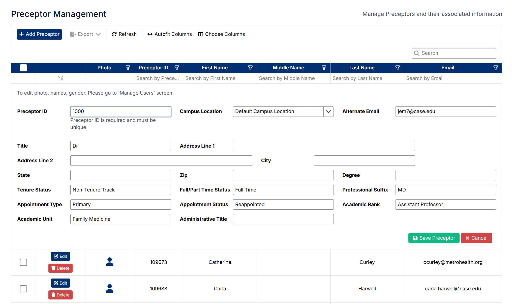 • A data grid displaying preceptor records
