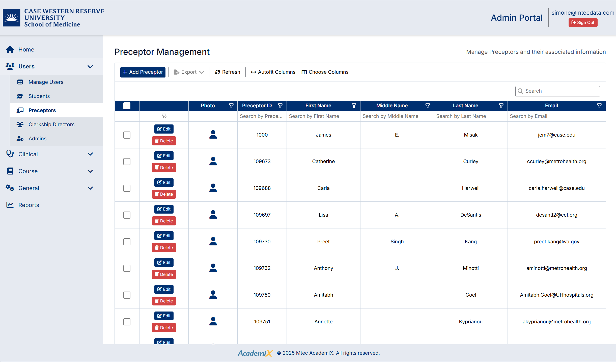 • A toolbar with actions such as Add Preceptor, Export, Refresh, and column settings