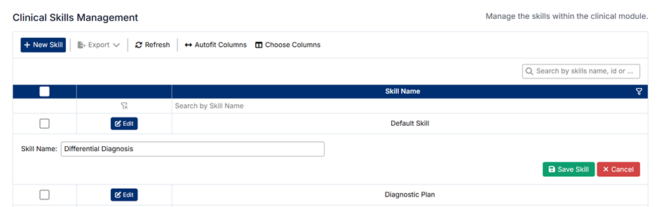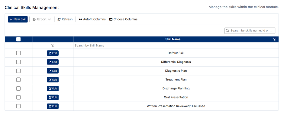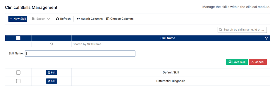 The Clinical Skills Management screen allows administrators to define and maintain the skills used within the clinical module. These skills represent the competencies students are expected to demonstrate and may be evaluated against during clinical training.