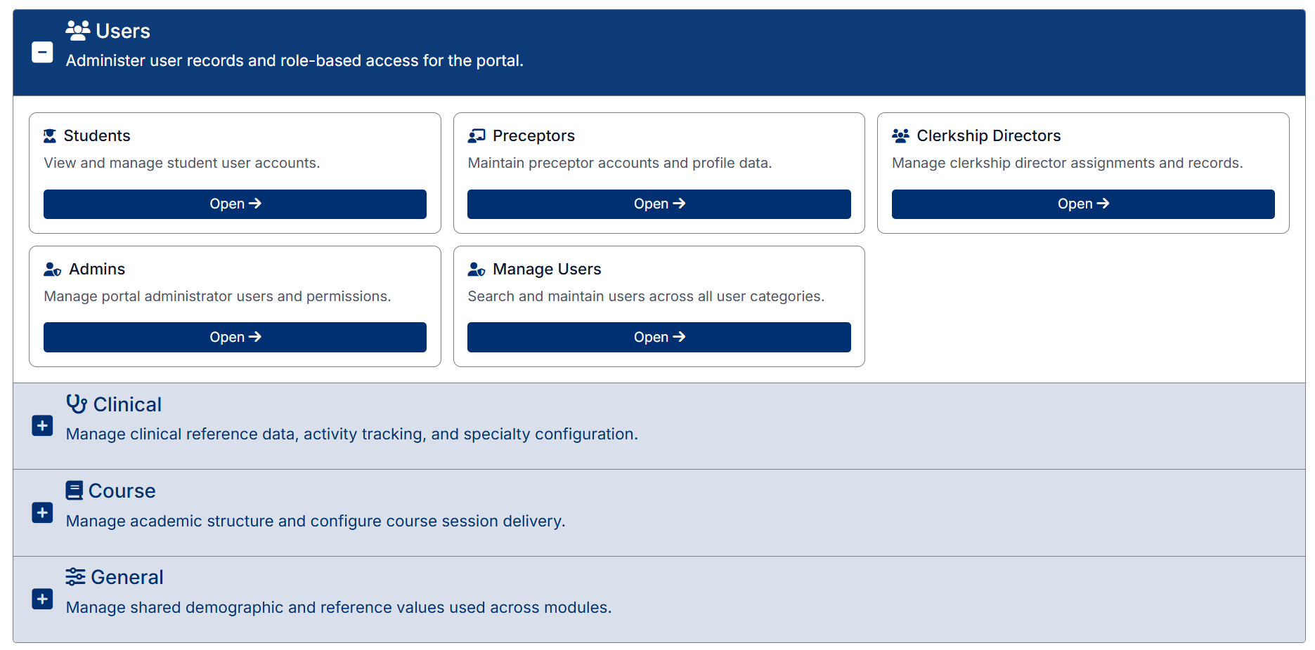 The Users module allows administrators to manage all user accounts within the system. This includes students, preceptors, clerkship directors, and administrative users.